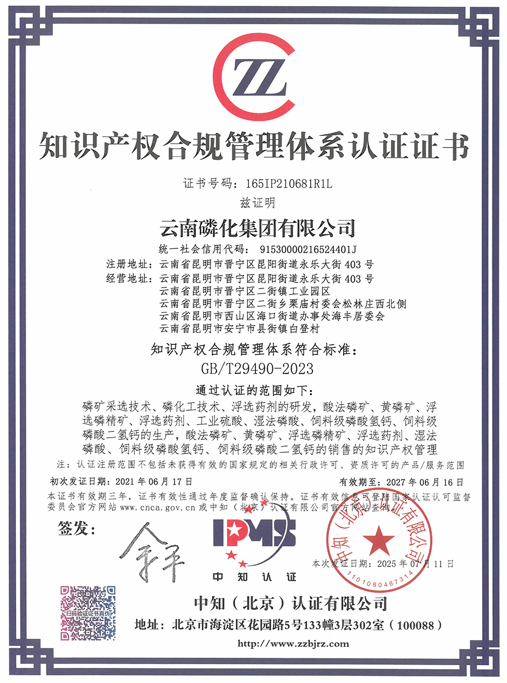 《企業(yè)知識產(chǎn)權(quán)合規(guī)管理體系要求》新標(biāo)準(zhǔn)于2024年1月1日正式實(shí)施,在《企業(yè)知識產(chǎn)權(quán)管理規(guī)范》基礎(chǔ)上對合規(guī)要素、覆蓋范圍和標(biāo)準(zhǔn)結(jié)構(gòu)進(jìn)行了優(yōu)化,為企業(yè)建立知識產(chǎn)權(quán)管理體系、防范知識產(chǎn)權(quán)風(fēng)險(xiǎn)、實(shí)現(xiàn)知識產(chǎn)權(quán)價(jià)值提供了參照標(biāo)準(zhǔn)。新標(biāo)準(zhǔn)突出了知識產(chǎn)權(quán)管理的合規(guī)屬性,強(qiáng)化了數(shù)字化轉(zhuǎn)型、風(fēng)險(xiǎn)防控及國際化合規(guī)要求,旨在推動(dòng)企業(yè)構(gòu)建覆蓋知識產(chǎn)權(quán)創(chuàng)造、保護(hù)、運(yùn)用及風(fēng)險(xiǎn)防控的全生命周期管理體系,強(qiáng)化合規(guī)經(jīng)營能力,提升核心競爭力。此次通過新標(biāo)準(zhǔn)認(rèn)證,標(biāo)志著公司在知識產(chǎn)權(quán)創(chuàng)造、運(yùn)用、保護(hù)和管理等關(guān)鍵領(lǐng)域達(dá)到了新的高度,全面升級至新版國家標(biāo)準(zhǔn)要求,進(jìn)一步鞏固了公司在磷化工領(lǐng)域的技術(shù)創(chuàng)新優(yōu)勢地位。
